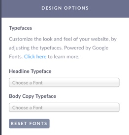 To change the Typeface in a StickyFolio, click Design Options in the Settings Panel. You can update the Headline Typeface (for headlines and subheads) or the Body Copy Typeface. The default Typeface for StickyFolios templates is Montserrat.